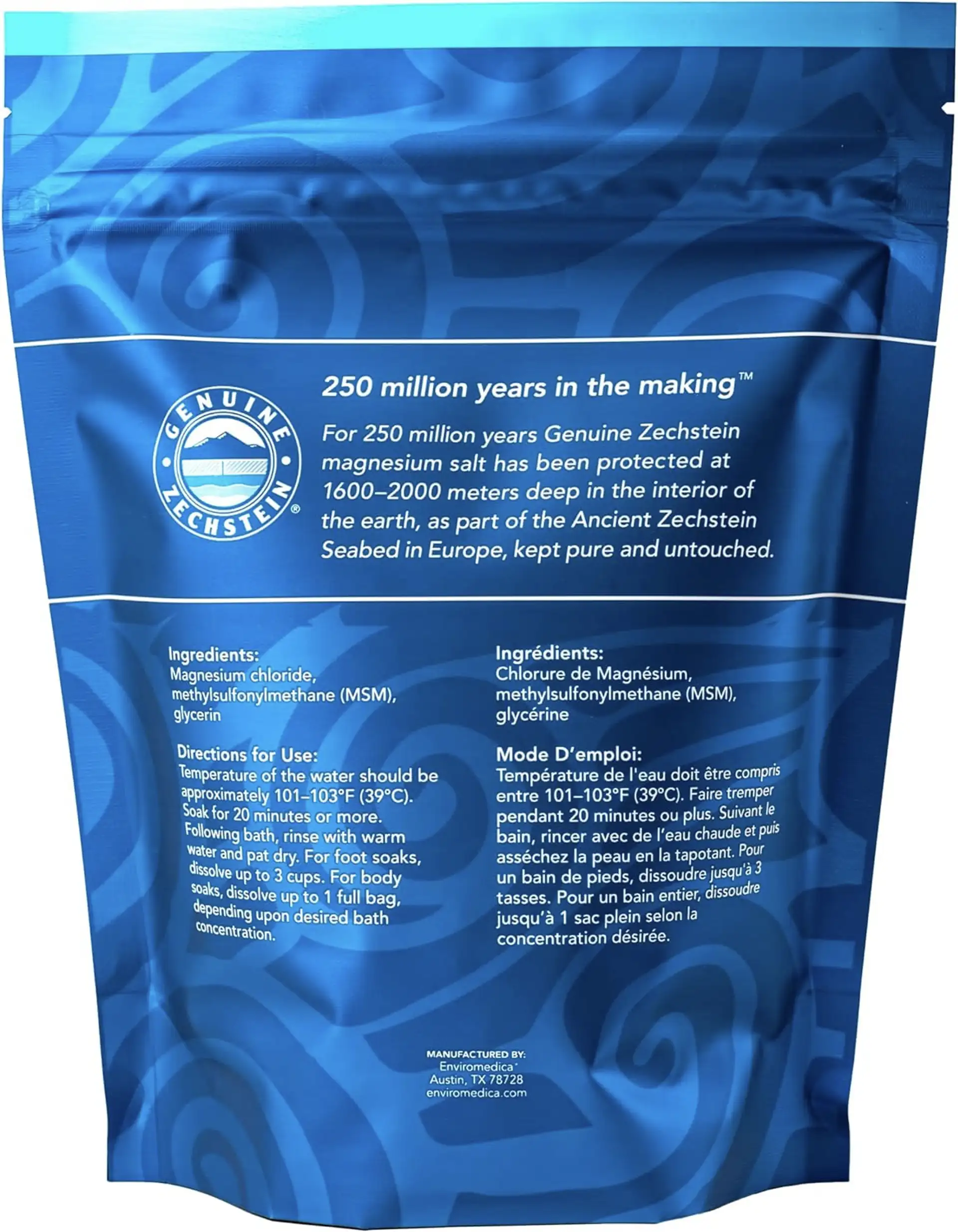 Dissolve 1-3 cups of magnesium flakes into a warm foot bath or full tub bath and soak for 30 minutes or more. Dissolve up to 8 lbs of magnesium flakes in a full tub bath for intense applications. Temperature of the water should be warm, but not hot. Hot water causes the skin to eliminate rather than absorb. Following the bath, rinse skin with cool running water, then pat skin dry with a towel and apply a natural moisturizer.